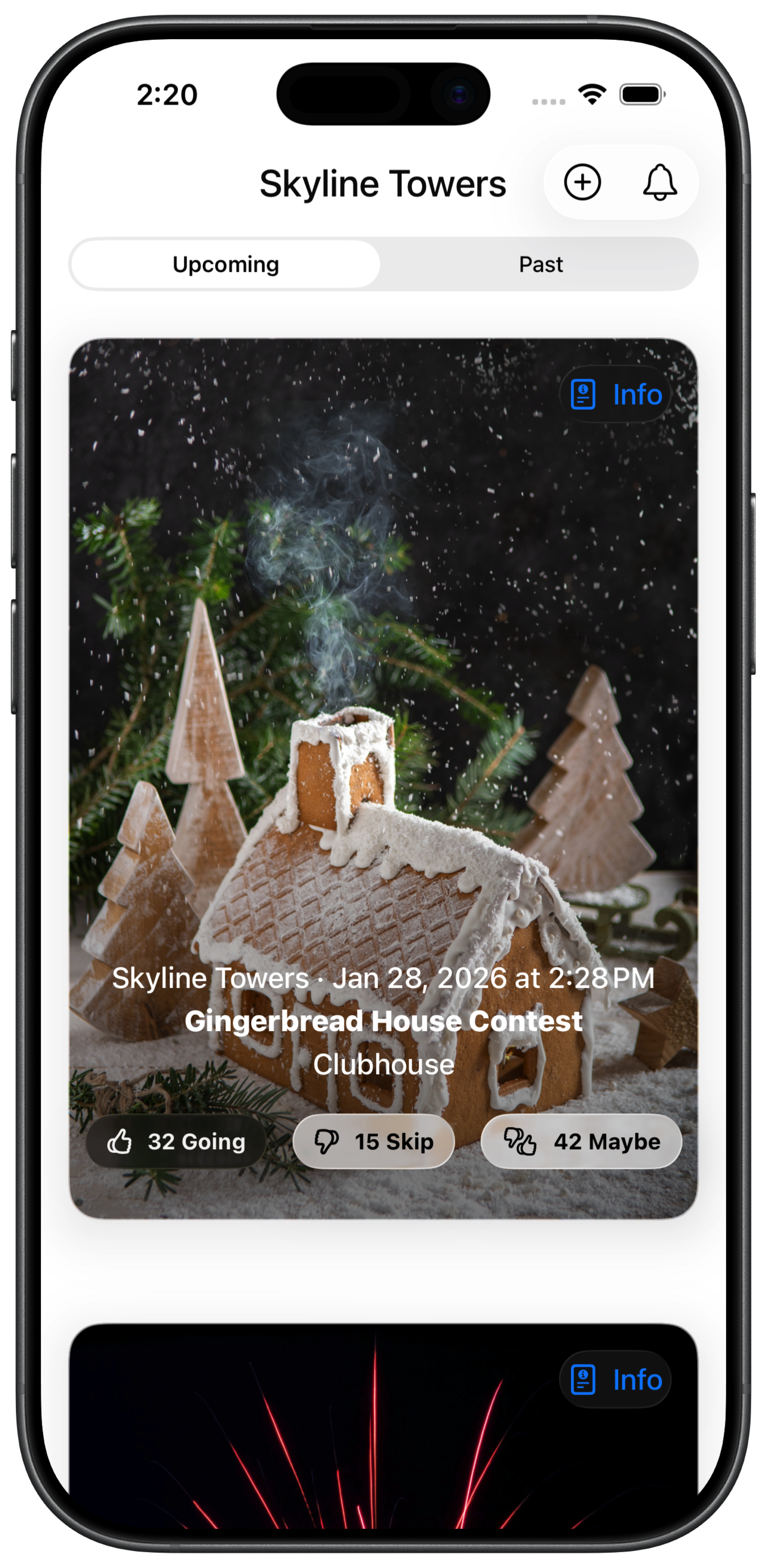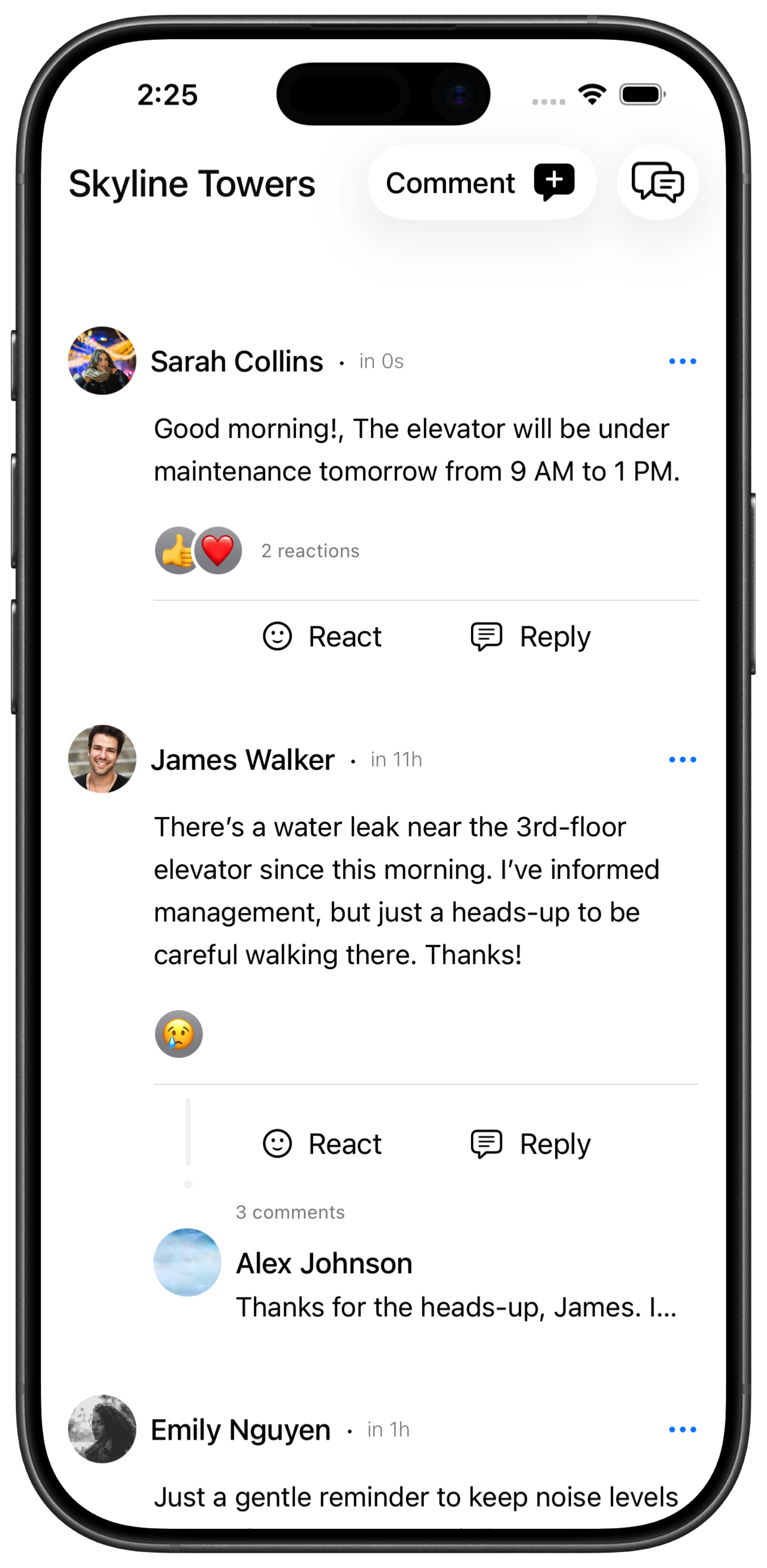 Stay connected with real-time community updates. Keep up with announcements, events, and important building news.